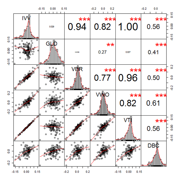 Other than its sexiness, this plot is very helpful. The diagonal gives you the return distribution of each ETF. I like to see how the returns are distributed—are the concentrated in the center? are there lots of outliers? are they heavily skewed? is something just weird? Indeed, this plot recently helped me immediately throw out a position under consideration because the distribution was barbelled (but more heavy left-tailed).