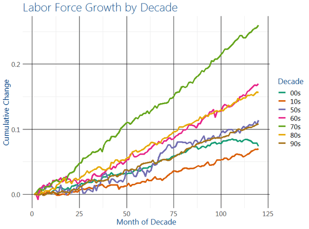 I just posted an interesting look at the growth of the labor force by decade. Given that I used R to produce it, I thought it interesting to share the R code and method. Just for reference, here is the chart: