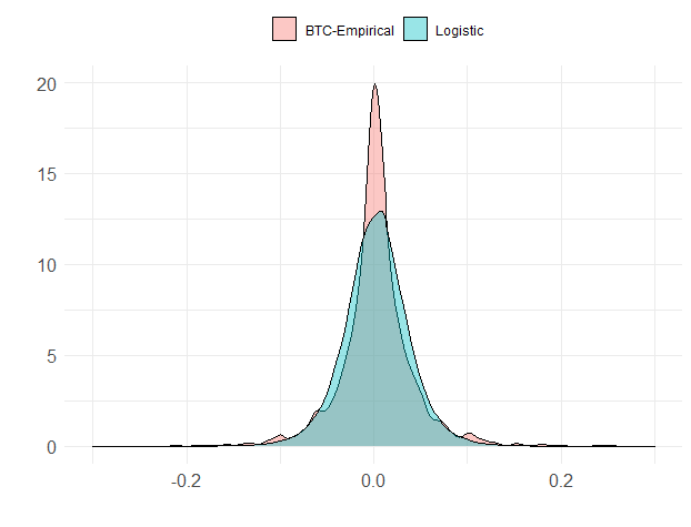 No big surprise here. Bitcoin’s daily price movements do not follow a Gaussian distribution. Small movements happen much more often and the extreme tails happen much more often more often than a Gaussian distribution would predict. Next, let’s look at the logistic distribution.