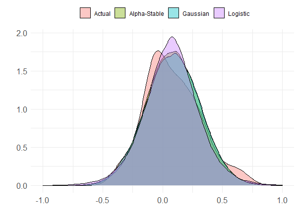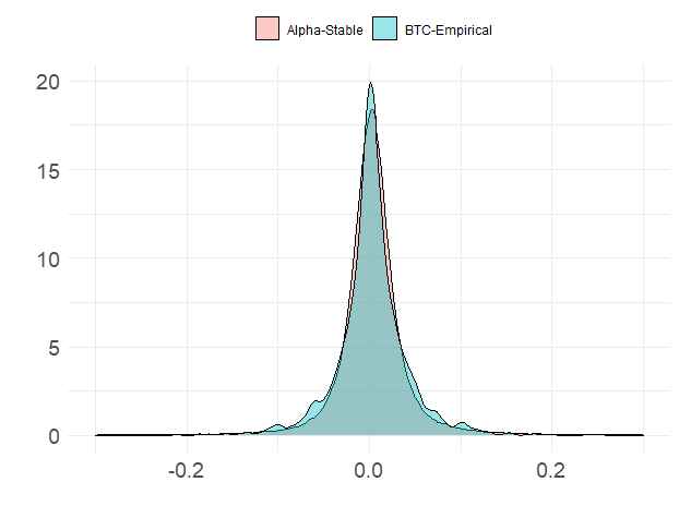 Logistic distributions have more persistence in the tails, and more clustering around the middle than Gaussian distributions (so, smaller shoulders). However, the logistic distribution still does not capture the skinnyness and tail-persistence of BTC. Let’s look at the alpha-stable distribution next.