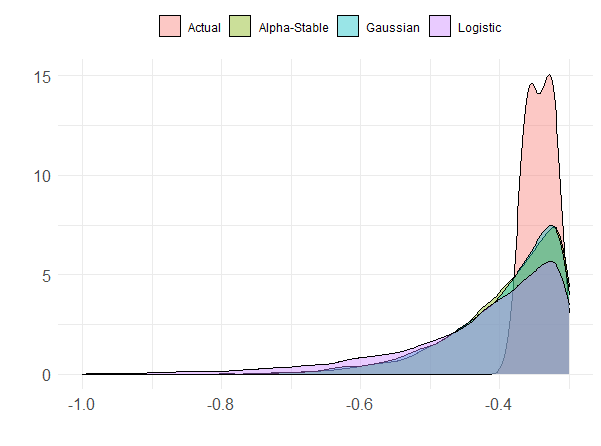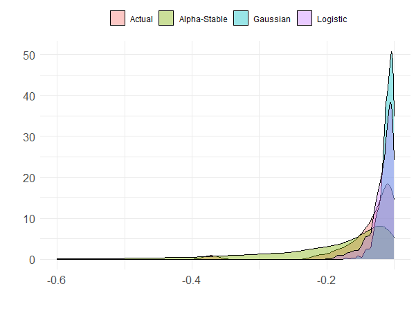 Here we are starting with the alpha-stable distribution parameter estimation. Using the libstableR package, we have to build an initial estimate, then feed that into a final estimate (using the Koutrouvelis method, for which a whole literature exists—I’ll let you GoogleScholar that if you feel like it).