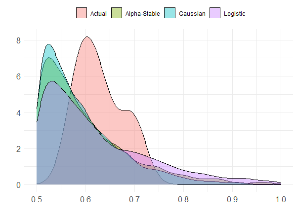 Very clearly, the alpha-stable distribution stands out as most likely. Indeed, even when you believe that the logistic distribution applies with 99% certainty, you must accept the alpha-stable distribution as the more likely so long as you expect it to apply with 25% certainty before you witnessed the event. And, as we can see, the Gaussian distribution is a terrible fit, no matter how much you believe it applies ahead of time.