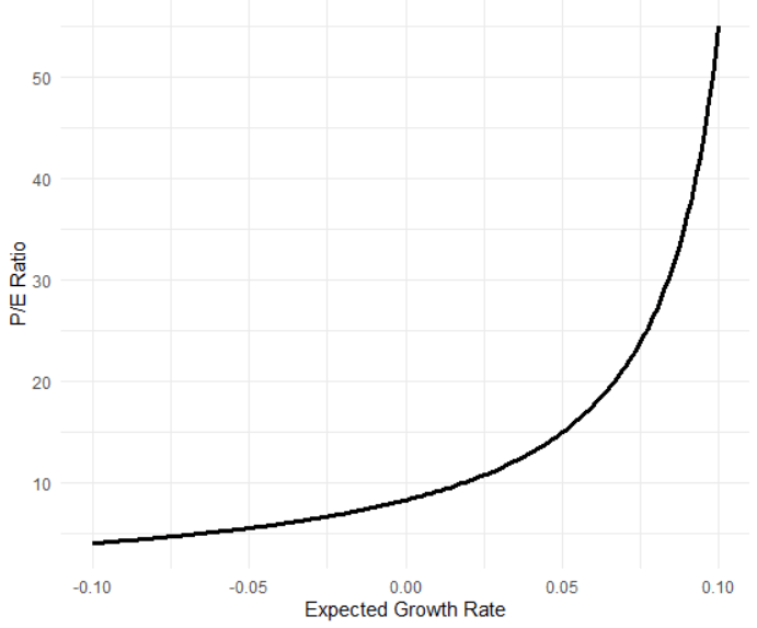 In this first plot we hold the discount rate constant at r = 0.12 and show how P/E is an exponential function of expected growth rates.